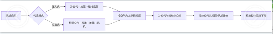 通風地籠網狀布局使得氣流覆蓋整個倉底,避免局部通風死角。孔洞設計使空氣緩慢滲出,減少糧堆“通風短路”。風機在通風系統出口(通常在糧面或上層),將糧堆內濕熱空氣吸出,外界空氣從糧面或其它入口進入。適用于降低上層糧溫或均衡糧堆整體溫度。冷空氣在向上穿透糧堆時,與糧食顆粒充分接觸:冷空氣吸收糧粒表面的熱量;流動空氣帶走糧粒間隙的熱空氣。吸熱后的空氣升溫變熱,攜帶糧堆水分(濕氣),從糧面逸出或被風機抽走。